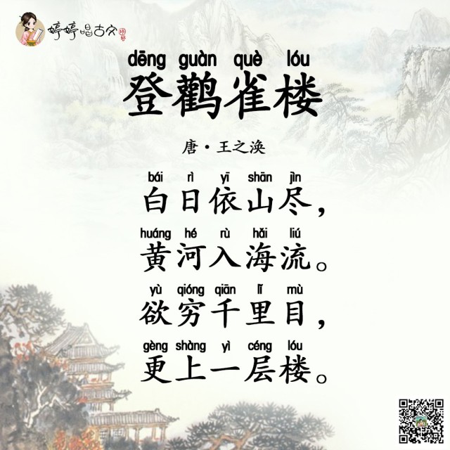 《登鹳雀楼》是唐代诗人王之涣赶考路过鹳雀楼写下的绝句。整首诗对仗工整,形式优美,气势如虹,在登高望远中展现了的诗人不凡的胸襟抱负,充满豪放和爽朗的情绪,也道出了要站得高才看得远的人生哲理。