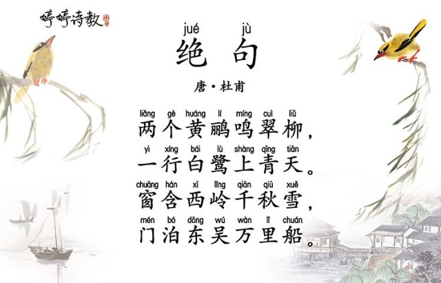 《绝句》是唐朝大诗人杜甫讲述在自己家中通过窗户看到的风景。唐代以后的诗,四句被称为“绝句”,八句被称为“律诗”,其他的叫“古体诗”。“绝句”是古诗体裁,一首诗四句,要求格式整齐押韵。每句五个字叫五言绝句,七个字叫七言绝句。
