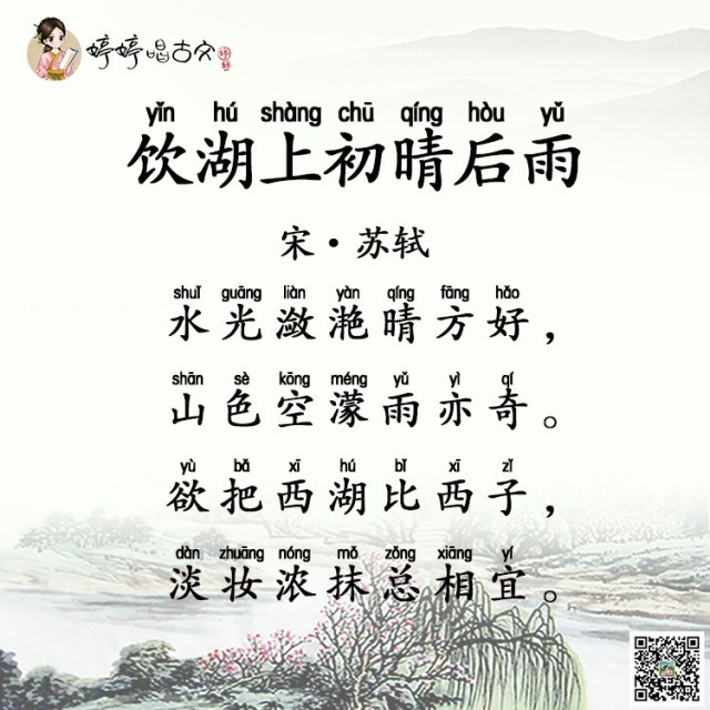 “饮湖上初晴后雨”,“饮湖上”是说诗人坐着小船在西湖上游玩、饮酒。“初晴后雨”讲的是天气刚开始是晴天,一会又下雨了。从诗题中,我们便对出游的时间、地点以及天气便有了初步了解。