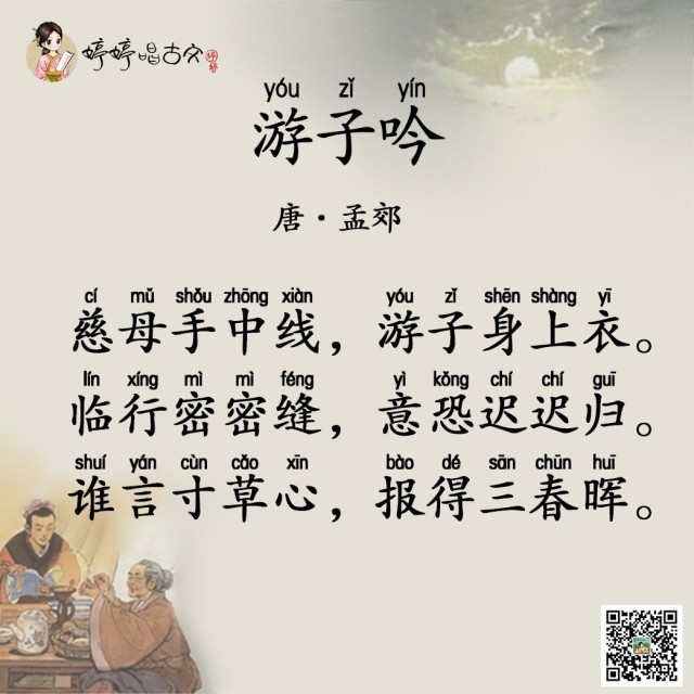 孟郊早年漂泊无依,一生贫困潦倒,直到五十岁时才得到了一个溧阳县尉的卑微之职。结束了长年的漂泊生活后,便将母亲接来同住。诗人仕途失意,饱尝了世态炎凉,此时愈觉亲情之可贵,于是写出这首发自肺腑,感人至深的颂母之诗。如果你也学会了,就把这首诗唱给妈妈听吧,谢谢她对你的照顾和爱。