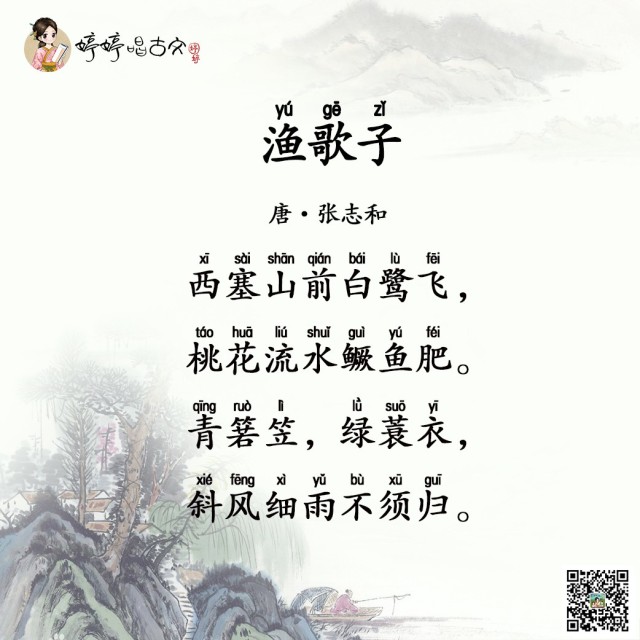 《渔歌子》是唐代诗人张志和隐居太湖作的一首词,整首词充满豪放和爽朗的情绪,西塞山,绿流水,飞白鹭,桃花开,句句无春,却处处春意。在如此美妙的山水里,渔翁沐浴春雨,唱歌捕鱼,开心自在!在《渔歌子》的诗教中,孩子可以随着诗人的视角,陶醉于山水,被渔翁那种捕鱼的快乐所感染。