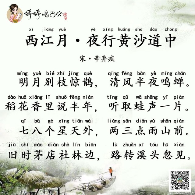 《西江月·夜行黄沙道中》是他40多岁被弹劾后,回到老家,当回一个农民时候的作品,写的是一派祥和的农家生活。他的号“稼轩”就是庄稼的意思,也是来源于这个时候。
