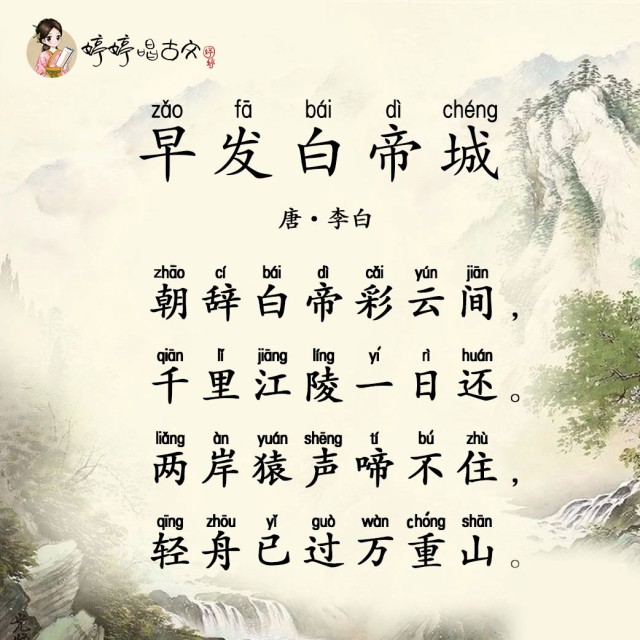李白乘船前往夜郎的途中,路过白帝城,碰见朝廷使者带来了皇帝赦免他的新诏令,命他返回京城。这消息让李白又惊又喜,好像做梦一样。于是他赶紧让船夫把自己送回京城,并在返回途中写下了这首《早发白帝城》。