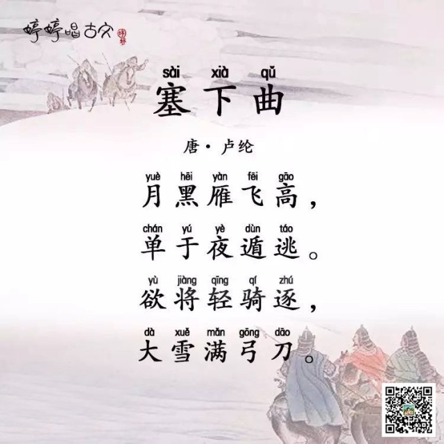 《塞下曲·月黑雁飞高》是卢纶《塞下曲》六首组诗中的第三首,描绘了将军雪夜准备率兵追敌的壮举,字里行间透露着豪迈的英雄气概。