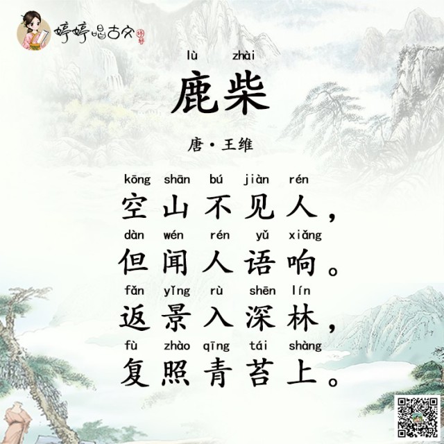 《鹿柴》是王维四十多岁后隐居辋川时写下的。描绘的是鹿柴附近的空山深林在傍晚时分的幽静景色。诗的绝妙处在于以声衬静,以局部衬全局,清新自然,毫不做作。在这首诗中,王维是诗人,是画家,更是音乐家。对语言的提炼,对光的把握,对声的感悟,刻画了空谷人语、斜辉返照那一瞬间特有的寂静清幽,耐人寻味。