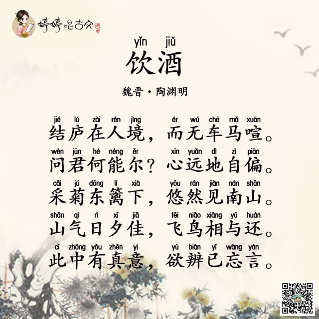 东晋末年,官场腐败,陶渊明辞官隐退,他常常酒后诗兴大发,抒发感慨,第二天清醒后再修改润色,写了一组诗,命名为《饮酒》。《饮酒》系列田园诗体现了陶渊明高洁傲岸的情怀,和安贫乐道的生活情趣,我们今天要学习的是其中流传最广的一首。