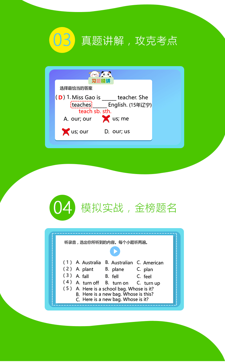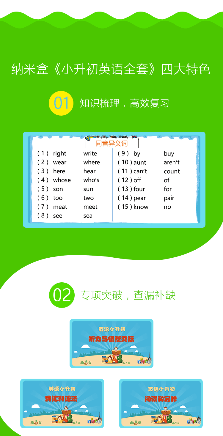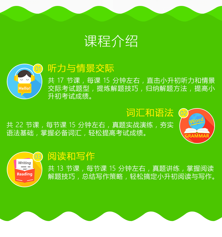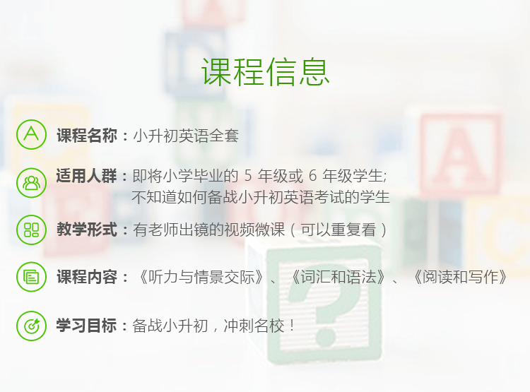 包含《词汇和语法》,《听力与情景交际》和《阅读和写作》三门课程。涵盖英语学科择校、分班考试的关键考点和方法指导,帮孩子攻克小升初英语考试,晋升名校。
