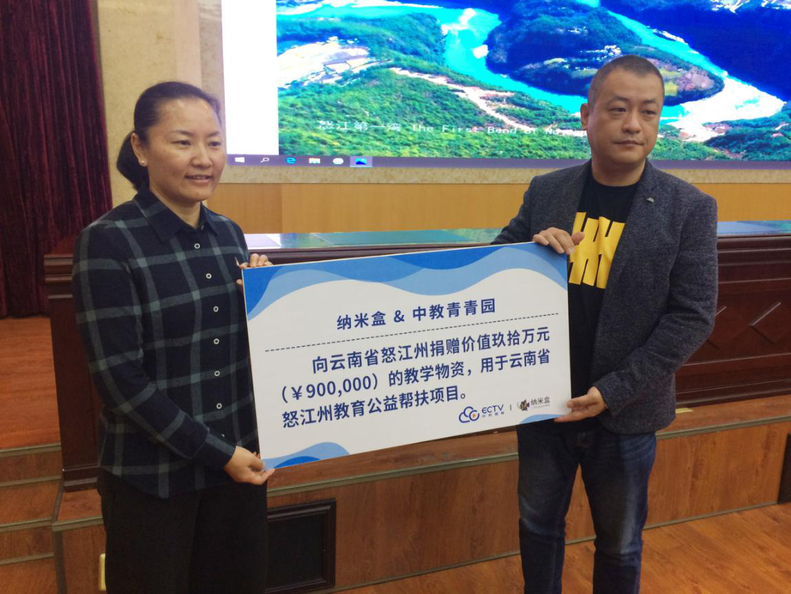 11月8日,纳米盒·上海进馨网络科技有限公司及旗下中教恩视教育科技(上海)有限公司,在云南省怒江州贫困县(泸水市、福贡县、贡山县、兰坪县),举行了“不忘初心助教育、聚力扶贫先扶智”的公益捐助活动。