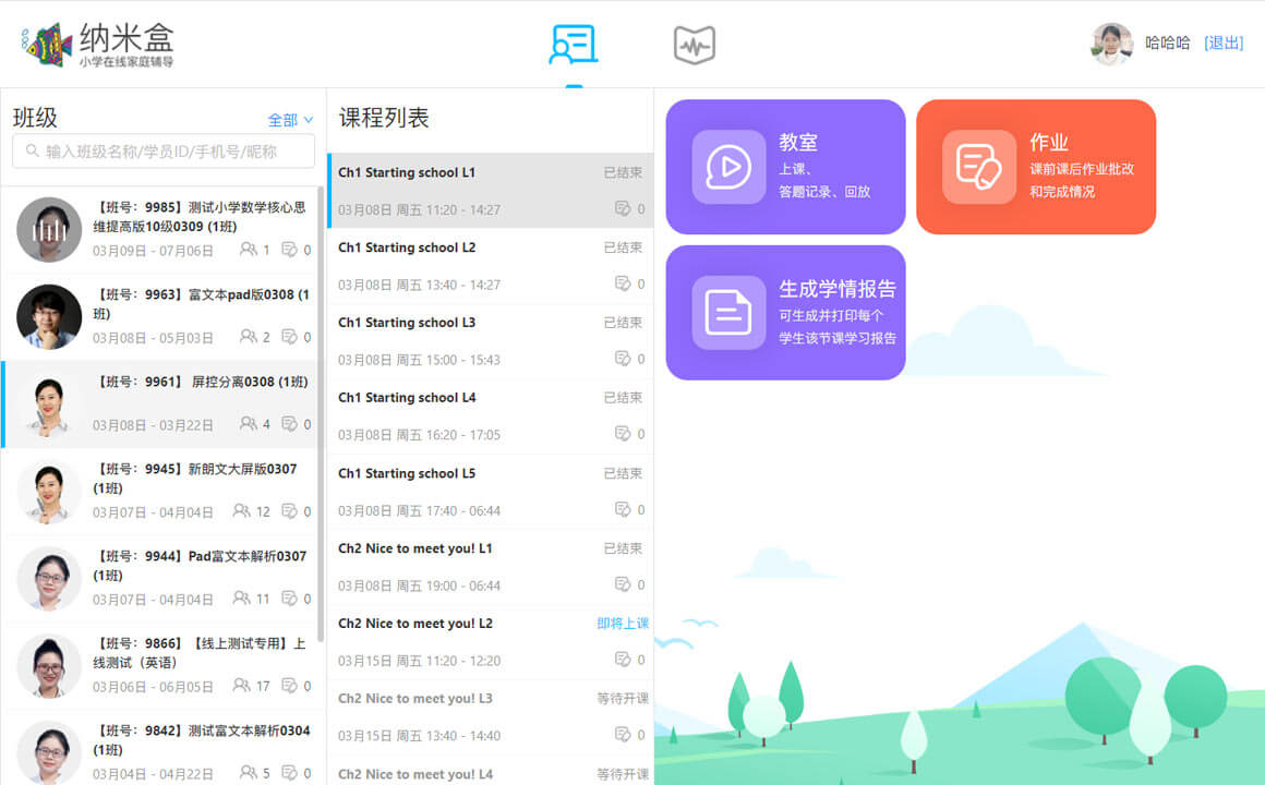 课程管理:这是辅导老师的主控制页面,教师在左侧选择课程,再从右侧对应的入口进入班级、作业和学期报告打印处,信息清晰可视。